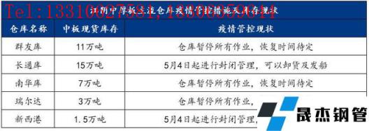 5月4日,江陰疫情爆發(fā),本地中厚板主流倉庫群友庫、南華庫、瑞爾達(dá)庫全部暫停所有作業(yè),卸貨、提貨均停止,涉及中板庫存量21萬噸。長通庫、新西港施行封閉管理,碼頭可以卸貨及發(fā)船,汽運停止,涉及中板庫存量16.5萬噸。此輪疫情管控,使得江陰本地40萬噸現(xiàn)貨中板庫存將近一半成為死庫存,另外一半流通性也大大減弱,具體明細(xì)如下: