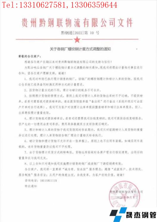 免責聲明:本網站(山東聊城晟杰無縫鋼管廠m.82912.cn)刊載的“貴州黔鋼聯物流有限公司關于各無縫鋼管廠家螺紋鋼計重方式調整的通知”等均源于網絡,版權歸原作者所有,且僅代表原作者觀點,本文所載信息僅供參考。轉載僅為學習與交流之目的,如無意中侵犯您的合法權益,請及時聯系刪除。本網站刊登此篇文章并不意味著本站贊同其觀點或證實其內容的真實性,我們不對其科學性、嚴肅性等作任何形式的保證。如果侵犯了您的版權,請盡快聯系我們予以撤銷,謝謝合作!