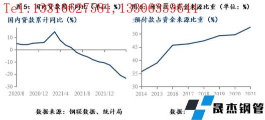 2020年8月,監管層設置“三道紅線”的監管指標,對房企進行分檔管理,限制其有息負債擴張速度;2021年1月,央行、銀保監會建立房地產貸款集中度管理制度,對銀行業金融進行管理制度,限制銀行資金過度流入地產行業。三道紅線及貸款集中制,限制了房地產企業表內融資能力,這兩個政策在2022年2月開始對地產市場產生沖擊,國內貸款同比自14.4%的高位持續回落,延續至今。至此,房地產企業的表外融資渠道、表內融資渠道都有較大限制,房地產資金短缺問題成為重要的麻煩。但此階段,房地產企業尚未出現大的危機,主要得益于房價上漲預期仍在,地產銷售偏好,預售資金來源尚能支撐地產企業運行。