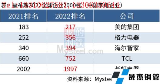免責聲明:本網站(山東聊城晟杰無縫鋼管廠m.82912.cn)刊載的“中國5家家電企業上榜福布斯2022全球企業2000強”等均源于網絡,版權歸原作者所有,且僅代表原作者觀點,本文所載信息僅供參考。轉載僅為學習與交流之目的,如無意中侵犯您的合法權益,請及時聯系刪除。本網站刊登此篇文章并不意味著本站贊同其觀點或證實其內容的真實性,我們不對其科學性、嚴肅性等作任何形式的保證。如果侵犯了您的版權,請盡快聯系我們予以撤銷,謝謝合作!