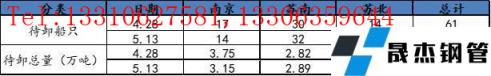 此次調研選取了南京、蘇州、無錫、常州、南通、徐州、揚州、鹽城八個城市,以建筑厚壁無縫鋼管為主要庫存的20家倉庫。通過匯總了解,當前樣本倉庫碼頭累計待卸船只總計53只,待卸總量達6.69萬噸。
