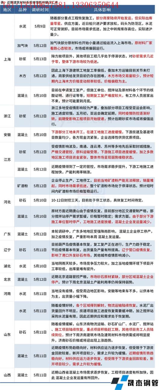 截至5月13日,據(jù)百年建筑網(wǎng)調(diào)研,12個(gè)省份建材市場受到了不同程度的影響。近期上海目前對全市建筑工地開展階梯式分類管理,重點(diǎn)聚焦涉疫工地,完善各項(xiàng)疫情防控措施,盡快實(shí)現(xiàn)建筑工地社會(huì)面清零,為建筑工地全面復(fù)工復(fù)產(chǎn)奠定基礎(chǔ)。加之近期華南地區(qū)雨水天氣來臨,運(yùn)輸和終端施工進(jìn)度受限,因此建材行情弱勢運(yùn)行。待全國疫情和汛期有所好轉(zhuǎn),公路、高速等基建項(xiàng)目支撐起一定需求,部分材料的發(fā)運(yùn)量會(huì)有所提升。具體情況如下: