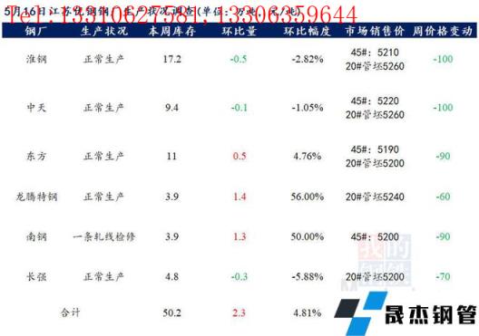 江蘇優特無縫厚壁鋼管廠家棒材總庫存50.2萬噸,較上周增加2.3萬噸,環比增4.81%,較去年同期增加13.41萬噸,同比增36.45%。