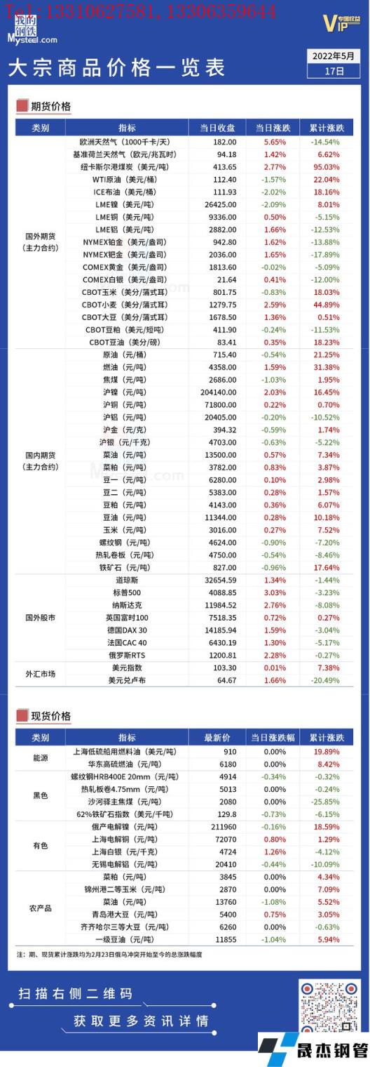 免責聲明:本網站(山東聊城晟杰無縫鋼管廠m.82912.cn)刊載的“俄烏局勢丨大宗商品價格一覽表(5月17日)”等均源于網絡,版權歸原作者所有,且僅代表原作者觀點,本文所載信息僅供參考。轉載僅為學習與交流之目的,如無意中侵犯您的合法權益,請及時聯系刪除。本網站刊登此篇文章并不意味著本站贊同其觀點或證實其內容的真實性,我們不對其科學性、嚴肅性等作任何形式的保證。如果侵犯了您的版權,請盡快聯系我們予以撤銷,謝謝合作!