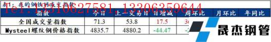 訊:全國建筑厚壁無縫鋼管成交量監(jiān)測,成交量相對指數(shù)來看,全國71.3增17.5,北方53.1增12.4,華東93.3增21.9,南方59.3增15.9。今日螺紋鋼價格指數(shù)4835.7,較上一交易日減44.47。