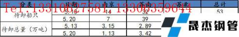 此次調研選取了南京、蘇州、無錫、常州、南通、徐州、揚州、鹽城八個城市,以建筑厚壁無縫鋼管為主要庫存的20家倉庫。通過匯總了解,當前樣本倉庫碼頭累計待卸船只總計53只,待卸總量達5.48萬噸。
