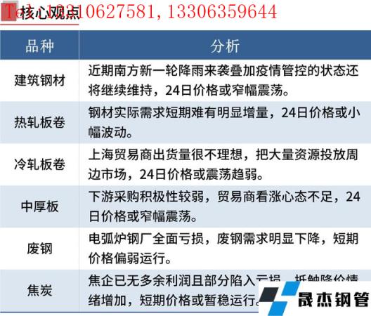 建筑厚壁無縫鋼管:5月23日,全國31個主要城市20mm三級抗震螺紋鋼均價4839元/噸,較上個交易日下跌10元/噸。短期來看,目前市場供應端同比持續低位,同時近期南方新一輪降雨來襲疊加疫情管控的狀態還將繼續維持,消費難有好轉預期。目前市場仍然處于供需雙弱的格局。短期市場關注點仍在于消費能否有效恢復以及雨季對于消費的影響,因此預計24日國內建筑厚壁無縫鋼管現貨價格窄幅震蕩為主。