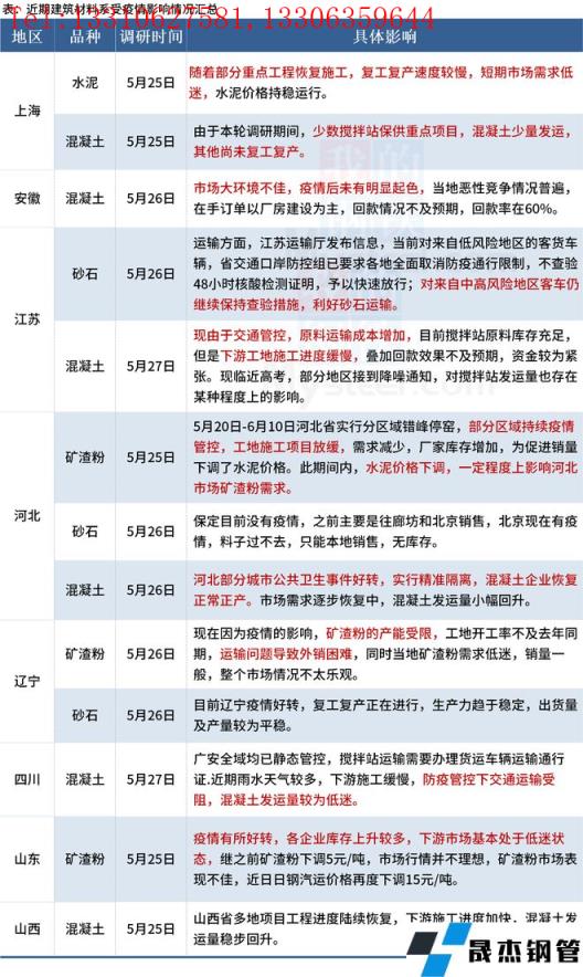 截至5月27日,據(jù)百年建筑網(wǎng)調(diào)研,8個省份建材市場受到了不同程度的影響。進(jìn)入五月下旬后,施工整體進(jìn)度尚未進(jìn)入“減速”階段,今年整體施工進(jìn)度提升緩慢,市場需求降幅拐點未來臨。目前疫情防控形勢繼續(xù)好轉(zhuǎn),建筑材料發(fā)運量有一定上升空間。現(xiàn)華東地區(qū)疫情雖得到了一定的控制,但由于交通管控因素,材料運輸仍存在一定壓力。具體情況如下: