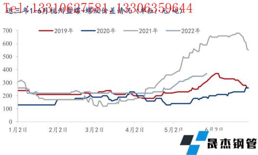由上圖所示,近三年1-6月份浙江市場盤螺螺紋價差在4-5月份均會呈現逐步擴大走勢,到6月中下旬會達到峰值,隨后逐步下行,回歸正常水平。