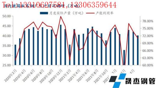 調研數據顯示:據監測的26家鍍錫板生產企業中,共計49條產線,2022年5月份產能利用率71.02%,月環比下降2.66%,同比下降5.08%;5月鍍錫板實際產量40.14萬噸,月環比減少2萬噸,同比減少3.32萬噸;另外,對國內重點鍍鉻生產企業調研數據顯示,5月份鍍鉻板產量共計7.32萬噸。