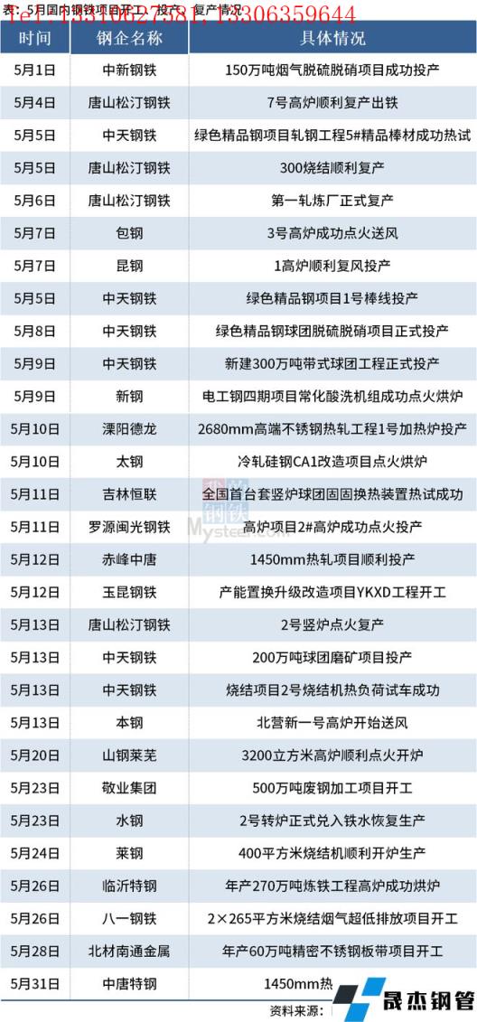 免責聲明:本網站(山東聊城晟杰無縫鋼管廠m.82912.cn)刊載的“5月國內29個鋼鐵項目開工、投產或復產”等均源于網絡,版權歸原作者所有,且僅代表原作者觀點,本文所載信息僅供參考。轉載僅為學習與交流之目的,如無意中侵犯您的合法權益,請及時聯系刪除。本網站刊登此篇文章并不意味著本站贊同其觀點或證實其內容的真實性,我們不對其科學性、嚴肅性等作任何形式的保證。如果侵犯了您的版權,請盡快聯系我們予以撤銷,謝謝合作!
