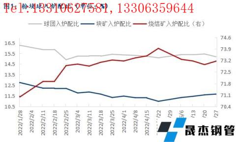 自今年春節(jié)開(kāi)始,無(wú)縫厚壁鋼管廠家高爐中粉礦、塊礦、球團(tuán)入爐配比變化趨勢(shì)明顯。截至5月27日, 64 家無(wú)縫厚壁鋼管廠家燒結(jié)礦配比73.2%,環(huán)比1月29日增加2.2個(gè)百分點(diǎn),同比去年同期增加1.8個(gè)百分點(diǎn);塊礦入爐比例11.7%,環(huán)比春節(jié)期間下降1.1個(gè)百分點(diǎn),同比降0.3個(gè)百分點(diǎn);球團(tuán)入爐配比15.2%,環(huán)比亦下降1.1個(gè)百分點(diǎn),同比降1.4個(gè)百分點(diǎn)。