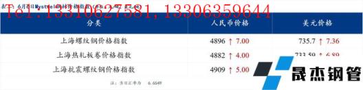 6月6日普鋼絕對價格指數(shù)變化:綜合指數(shù)5080.66,上漲14.13;螺紋鋼指數(shù)4850.55,上漲20.83;線材指數(shù)5249.06,上漲21.29;熱軋板卷指數(shù)4901.23,上漲11.73;冷軋板卷指數(shù)5353.19,上漲11.05;中厚板指數(shù)5086.67,上漲16.52。