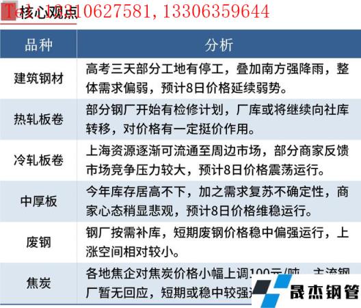 建筑厚壁無縫鋼管:6月7日,全國(guó)31個(gè)主要城市20mm三級(jí)抗震螺紋鋼均價(jià)4839元/噸,較上個(gè)交易日下跌15元/噸。高考三天,部分工地有停工,道路有封鎖,需求整體偏弱。疊加南方地區(qū)降雨天氣影響,整體需求仍然偏弱,因此預(yù)計(jì)8日國(guó)內(nèi)建筑厚壁無縫鋼管價(jià)格或?qū)⒀永m(xù)弱勢(shì)運(yùn)行態(tài)勢(shì)。