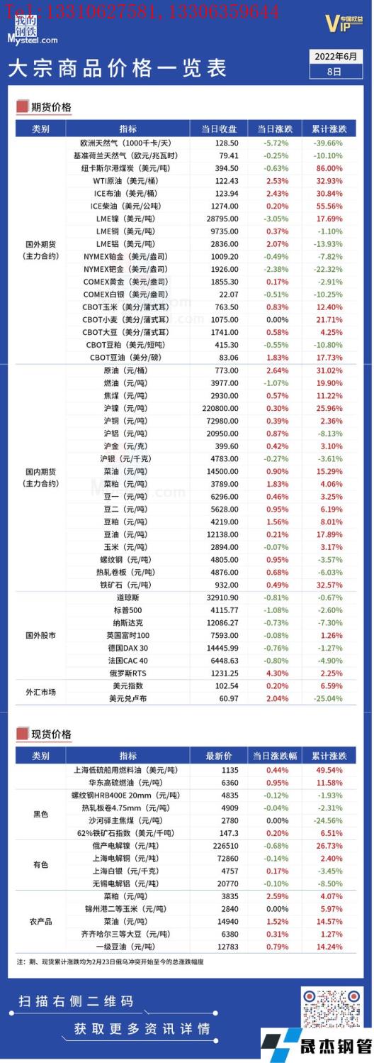 免責聲明:本網站(山東聊城晟杰無縫鋼管廠m.82912.cn)刊載的“俄烏局勢丨大宗商品價格一覽表(6月8日)”等均源于網絡,版權歸原作者所有,且僅代表原作者觀點,本文所載信息僅供參考。轉載僅為學習與交流之目的,如無意中侵犯您的合法權益,請及時聯系刪除。本網站刊登此篇文章并不意味著本站贊同其觀點或證實其內容的真實性,我們不對其科學性、嚴肅性等作任何形式的保證。如果侵犯了您的版權,請盡快聯系我們予以撤銷,謝謝合作!