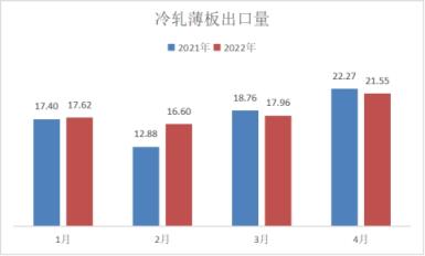 冷軋品種出口方面,4月份出口量同比下降,尤其以冷軋薄寬帶下降幅度最大,具體數據來看,冷軋薄板出口量為21.55萬噸,同比下降3.23%;冷軋薄寬帶出口量為21.5萬噸,同比下降64.46%,冷軋窄鋼帶出口量為3.79萬噸,同比下降1.81%。