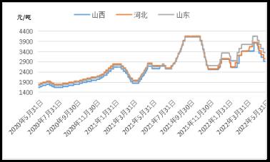 據云商平臺監測數據顯示,截至5月31日,山西臨汾地區二級冶金焦含稅出廠價在2930元,較月初跌900元;唐山地區二級冶金焦含稅出廠價在3050元,較月初跌800元;山東淄博地區二級冶金焦含稅出廠價在3360元,較月初跌800元(詳見圖3)。