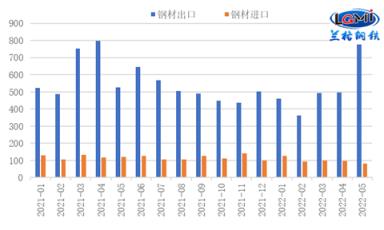 進(jìn)口方面,由于國(guó)內(nèi)疫情對(duì)制造業(yè)的沖擊仍存,且海外市場(chǎng)價(jià)格優(yōu)勢(shì)不足,進(jìn)口仍呈下降態(tài)勢(shì)。5月份,我國(guó)進(jìn)口厚壁鋼管80.6萬噸,環(huán)比下降16.0%,同比下降33.2%;1-5月累計(jì)進(jìn)口厚壁鋼管498.0萬噸,同比下降18.3%。