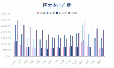 1-5月份,冰箱產(chǎn)量3401.0萬臺(tái),同比下降8.1%;彩電產(chǎn)量7441.0萬臺(tái),同比增長(zhǎng)4.5%;洗衣機(jī)產(chǎn)量3471.7萬臺(tái),同比下降4.1%;空調(diào)產(chǎn)量9933.5萬臺(tái),同比下降0.8%。