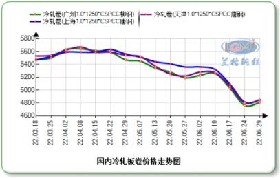 云商平臺監(jiān)測數(shù)據(jù)顯示,截至6月29日,全國1.0mm冷軋市場均價為4922元(噸價,下同),比5月末下跌455元。主導(dǎo)城市上海唐鋼1.0mm冷軋卷市場價格為4850元,比5月末下跌510元;北京首鋼1.0mm冷軋卷5000元,比5月末下調(diào)430元;天津唐鋼1.0mm冷軋大卷4850元,比5月末下跌370元。