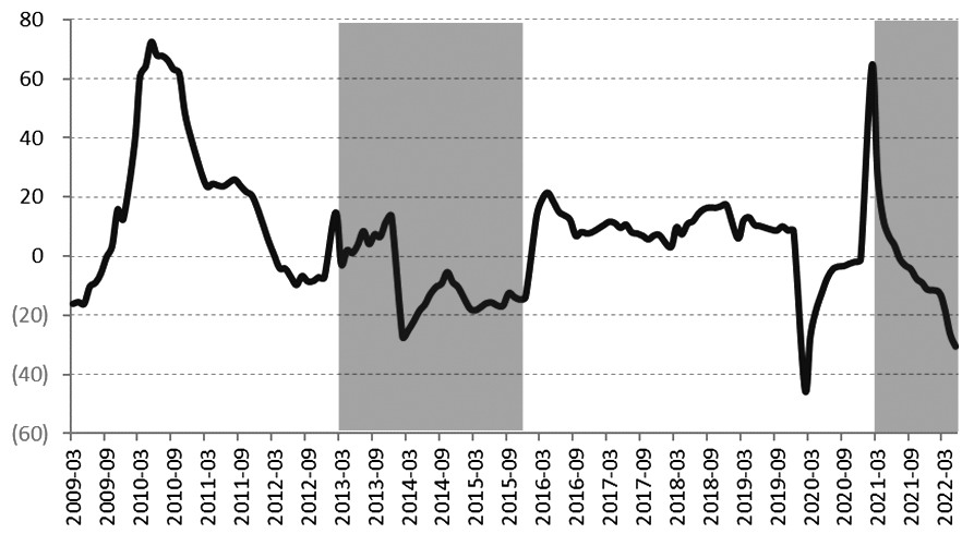 可以看到,在2013—2015年期間,雖然厚壁無縫鋼管行業進入了負債率高、利潤持續低迷的狀態,但是粗鋼產量仍然保持著持續增長趨勢。厚壁無縫鋼管行業的供應彈性顯著偏低。今年以來,我國粗鋼的供應環境和2021年相比發生了顯著改變。2021年,在“碳達峰、碳中和”政策的驅動下,行業通過“能耗雙控”的方式,首度實現粗鋼產量同比下降。然而,自2021年第四季度以來,隨著“運動式減碳”方式修正,粗鋼生產的政策束縛消散,粗鋼產量重回增長趨勢。對比2013年和今年的粗鋼供應環境,筆者認為,兩者之間最主要的一個相似特征是供應均呈現增長趨勢。