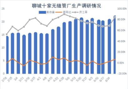 據網對全國200條無縫管樣本生產線統計(含長流程無縫鋼管廠40條生產線,詳見圖3),截至6月30日生產線開工率62%,較去年同期下降8.2個百分點。臨沂地區65條生產線(含1條連軋機組,詳見4)開工率34.92%,較去年同期下降25.5個百分點。臨沂地區7家管廠總庫存8.02萬噸,較去年同期減少2.5萬噸。原料管坯庫存5.75萬噸,較去年同期減少2.32萬噸。聊城地區32條產線(詳見圖5)開工率78%,較去年同期下降1個百分點。原料庫存23.5萬噸,較去年減少13.8萬噸。