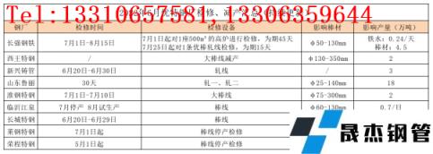 上半年無縫鋼管廠家出廠價格以下調為主要基調,優(yōu)特鋼尤其普優(yōu)品種6月中下旬出現虧損,且在需求萎縮、庫存壓力、前景迷茫、無重大政策支撐的情況下,個別無縫鋼管廠家開始增加停產、減產計劃,預計7月份優(yōu)特鋼產量有所下降,具體檢修情況如下: