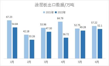 2022年6月我國涂層板(帶)出口總量共計52.10萬噸,月環(huán)比上升5.73%,年同比下降8.94%。2022年1-6月我國涂層板(帶)出口總量共計273.49萬噸,年同比下降19.12%。