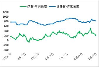 7月在統計高爐開工率連續4周下降。7月28日,網統計全國主要厚壁無縫鋼管企業高爐按容積計算產能利用率75.33%,較上月末下降4.47個百分點;統計重點鋼企日鐵水產量19.2萬噸,較上月下降6.26%。其中7月唐山在統計熱軋帶鋼產線平均產能利用率62.14%,環比下降10.86個百分點。不過,月內卷帶價差縮小,冷軋基料、帶鋼和熱卷之間的可替代性增強。全國熱軋無縫鋼管廠家庫存72.3萬噸,熱軋社庫272.11萬噸;帶鋼社庫87.41萬噸,同比增加8.12萬噸。當前焊鍍管產業鏈社庫仍為年內次高值,供應端虧損態勢超出預期,無縫鋼管廠家產量處三年來的低位水平,但預計社庫在8月份或達到去年同期最高位水平。