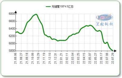 據(jù)云商平臺監(jiān)測數(shù)據(jù)顯示:截至7月29日,國內(nèi)十大主導(dǎo)城市108*4.5無縫管市場均價5805元,較上月同期跌205元。